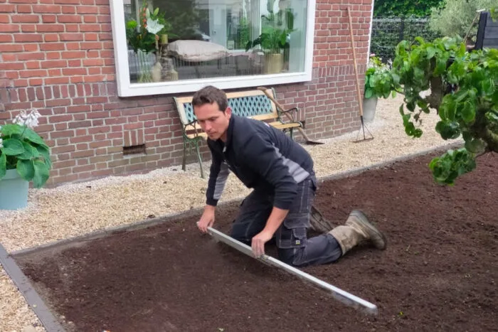 Marc legt de voordelen van gazonaanleg in het najaar uit. ‘In het najaar, uitgezonderd periodes met vrieskou, slaan graszoden béter aan dan in het voorjaar. Dat zit zo: graszoden komen pas na een jaar van het land. Hierdoor bevatten de zoden goede grond, waar het gras de winter probleemloos mee doorkomt. Omdat de gelegde graszoden in het najaar en in de winter in een rusttoestand verkeren, kan vrieskou geen kwaad. Zodra het voorjaar wordt zet de grasgroei in, maar ook de synergie met het lokale bodemleven. Eventuele verkleuringen trekken dan bij. Feitelijk vormt het najaar de aanlegperiode bij uitstek voor gazon.’
