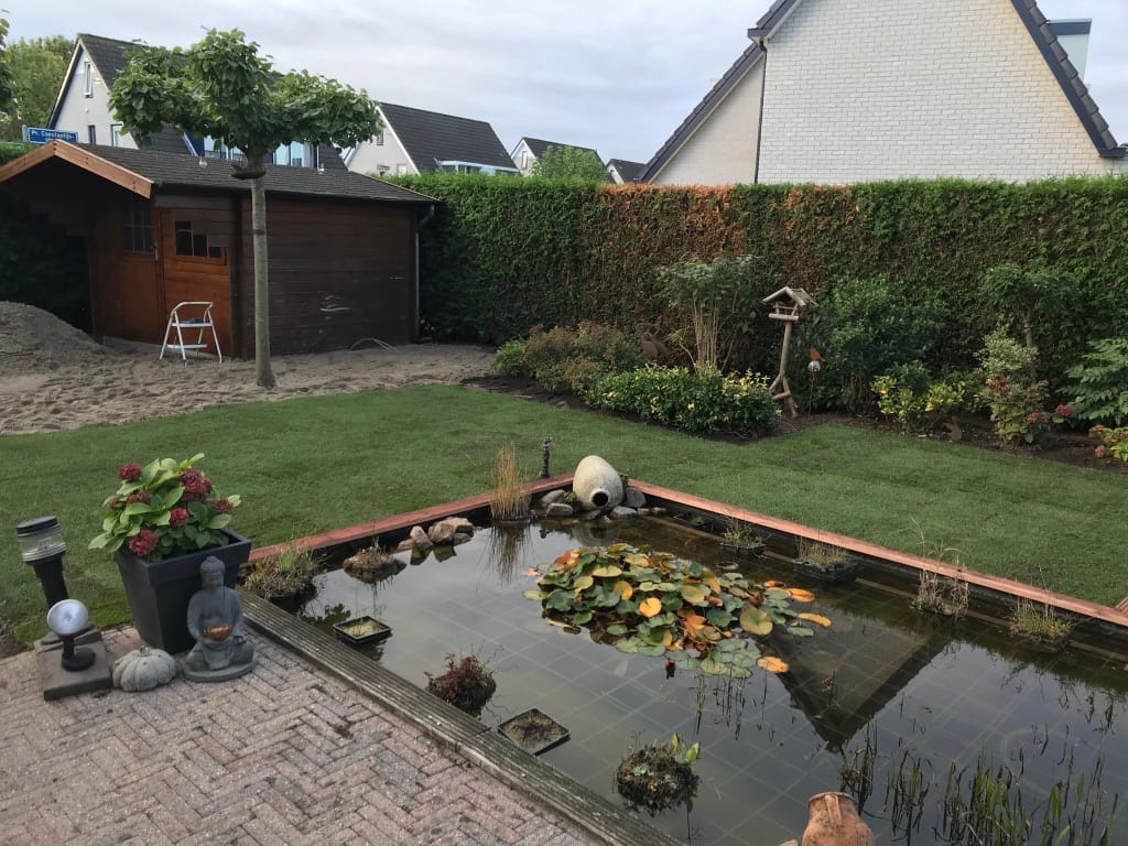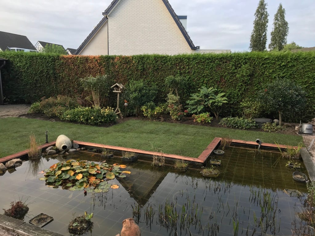 Bij de renovatie van de tuin in Arnhem hebben we om de vijver een strak gazon mogen aanleggen. Daarnaast is er ook een trampoline ingegraven en hebben we de nieuwe graszoden op het oude gazon laten aansluiten. Het aansluiten kan goed gedaan worden door met een schep een randje in het gras te steken en daarna het gras/grond 2 cm dik weg te steken. De nieuwe zoden zijn ongeveer 2 cm dik en sluiten in de hoogte dan mooi aan op het oude gazon.