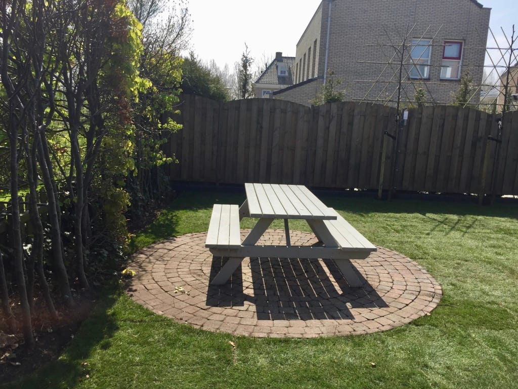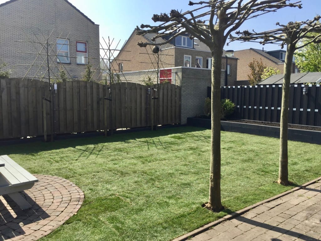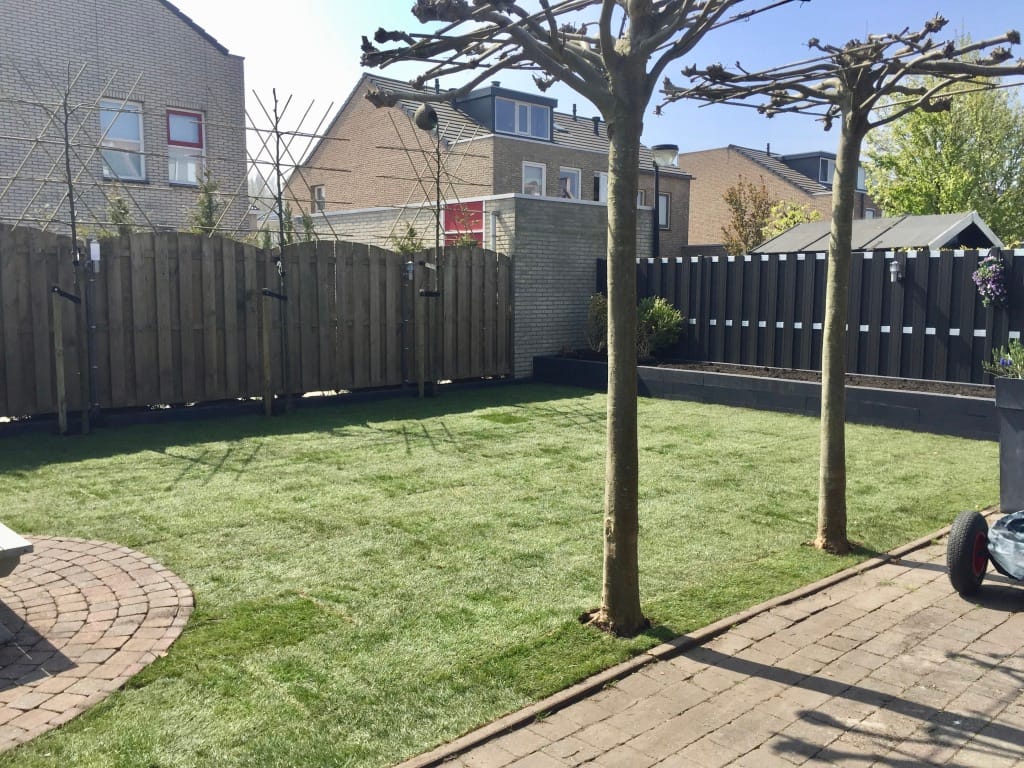Voor deze klant in Beverwijk hebben we het oude gazon verwijdert en nieuwe graszoden aangelegd. Graszoden kunnen we heel mooi aansluiten op bestaand straatwerk zoals u hier goed kan zien bij het ronde zitje van straatwerk. Onze graszoden zijn ongeveer 2 tot 2,5 cm dik.