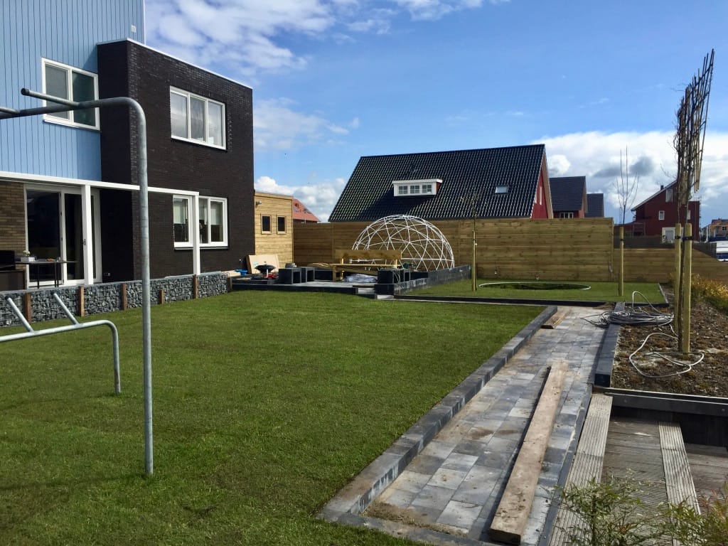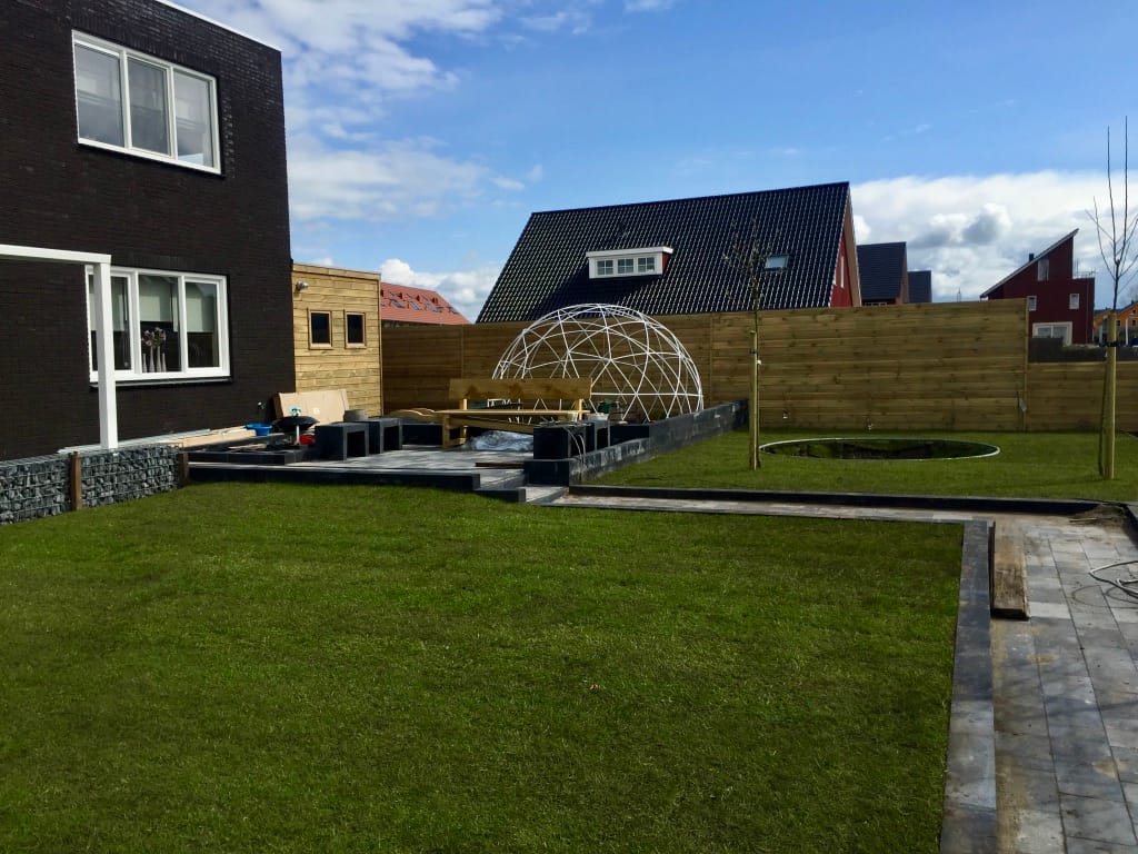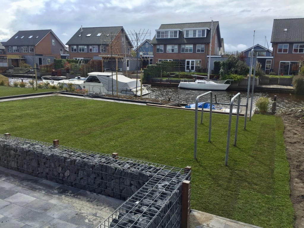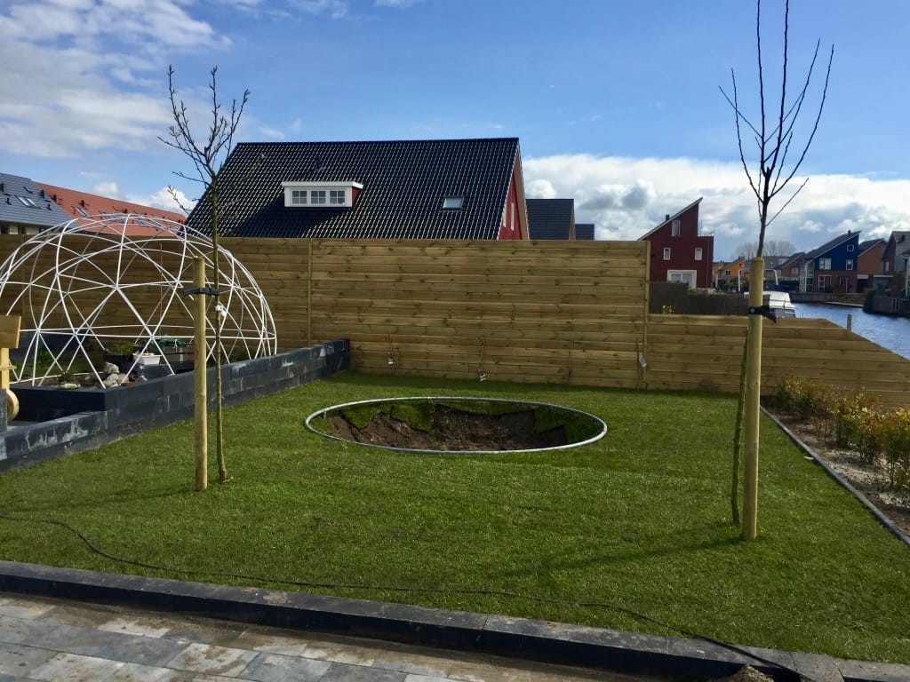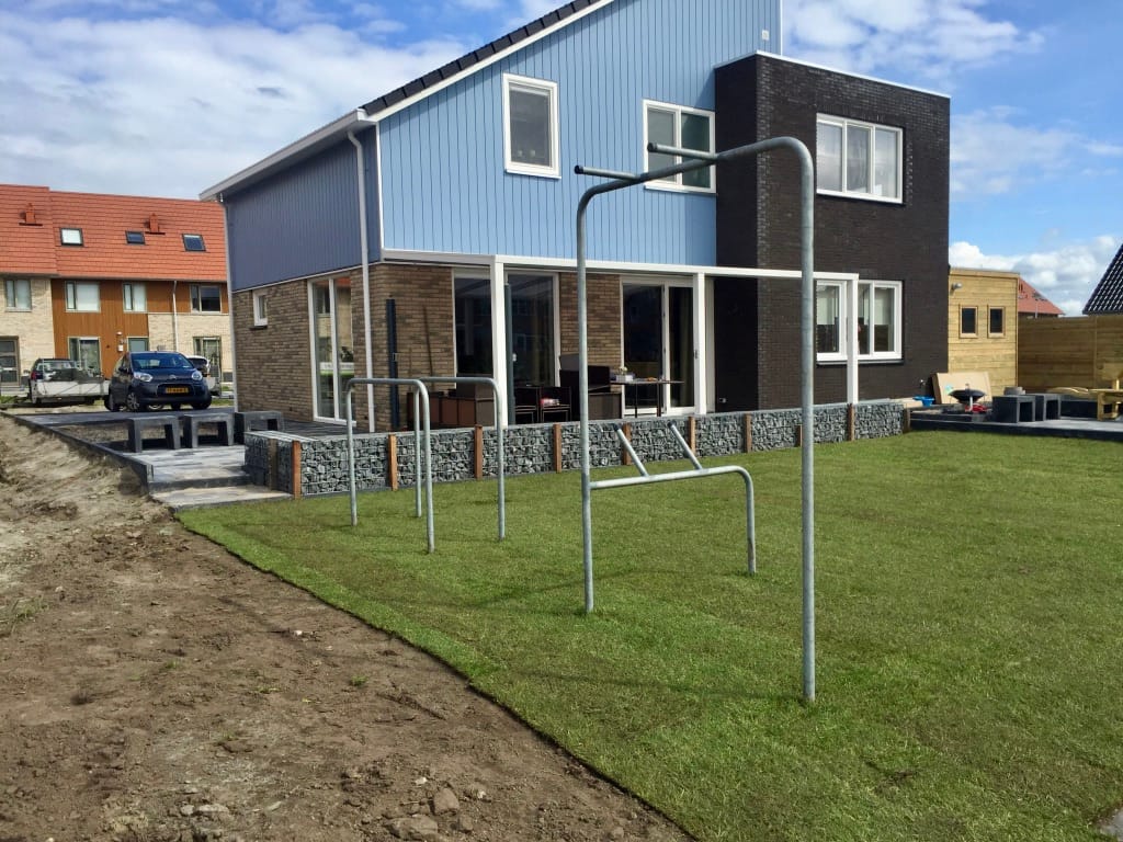 Dat een gazon multifunctioneel kan zijn bewijst deze tuin in Drachten. Aan een zijde van de tuin is een trampoline ingegraven waar graszoden omheen zijn gelegd. Aan de andere kant zijn fitness onderdelen geplaatst om sportief aan de slag te kunnen. Wij kunnen de graszoden strak om de obstakels heen leggen waardoor het een geheel wordt.