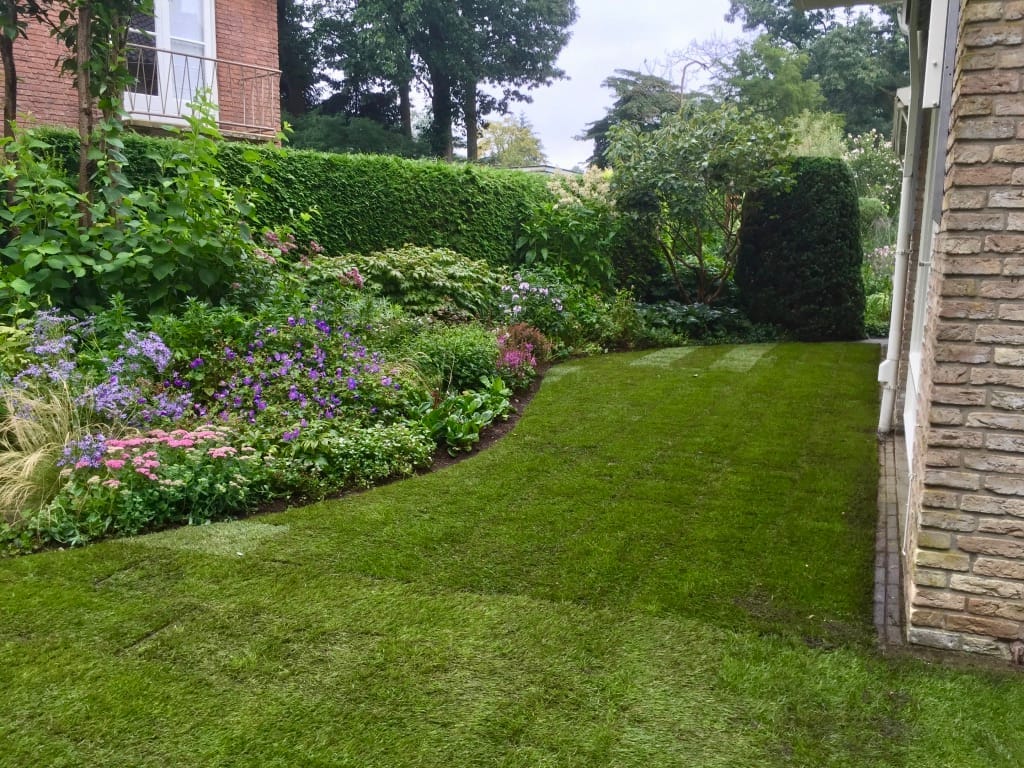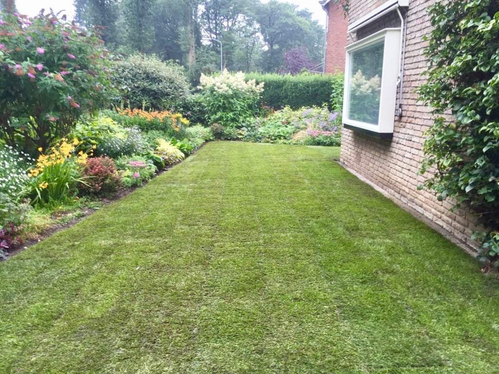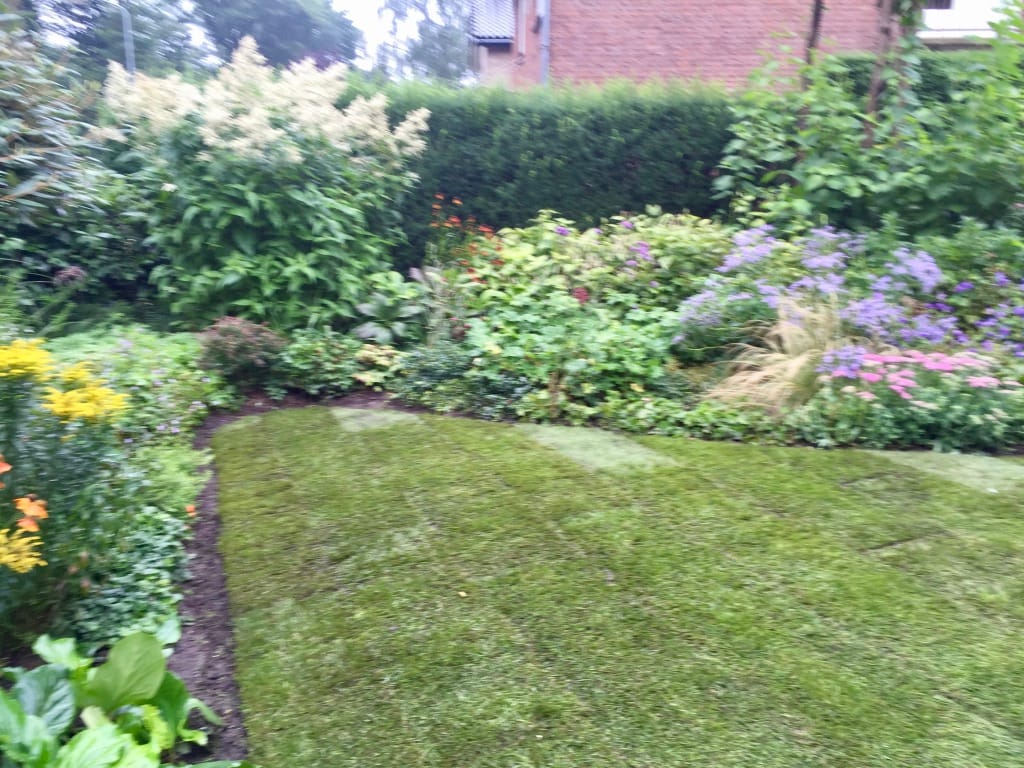 In Ede hebben we in een winderige bloementuin 75 vierkante meter oud gras verwijdert. Wanneer we oud gras verwijderen dan voeren we de oude zoden ook af. Dit geeft een mooi zwarte grondlaag die we kunnen bewerken met de freesmachine. Na het egaliseren zijn de meeste bewerkingen gedaan en zie je tijdens het gras leggen snel resultaat ontstaan.