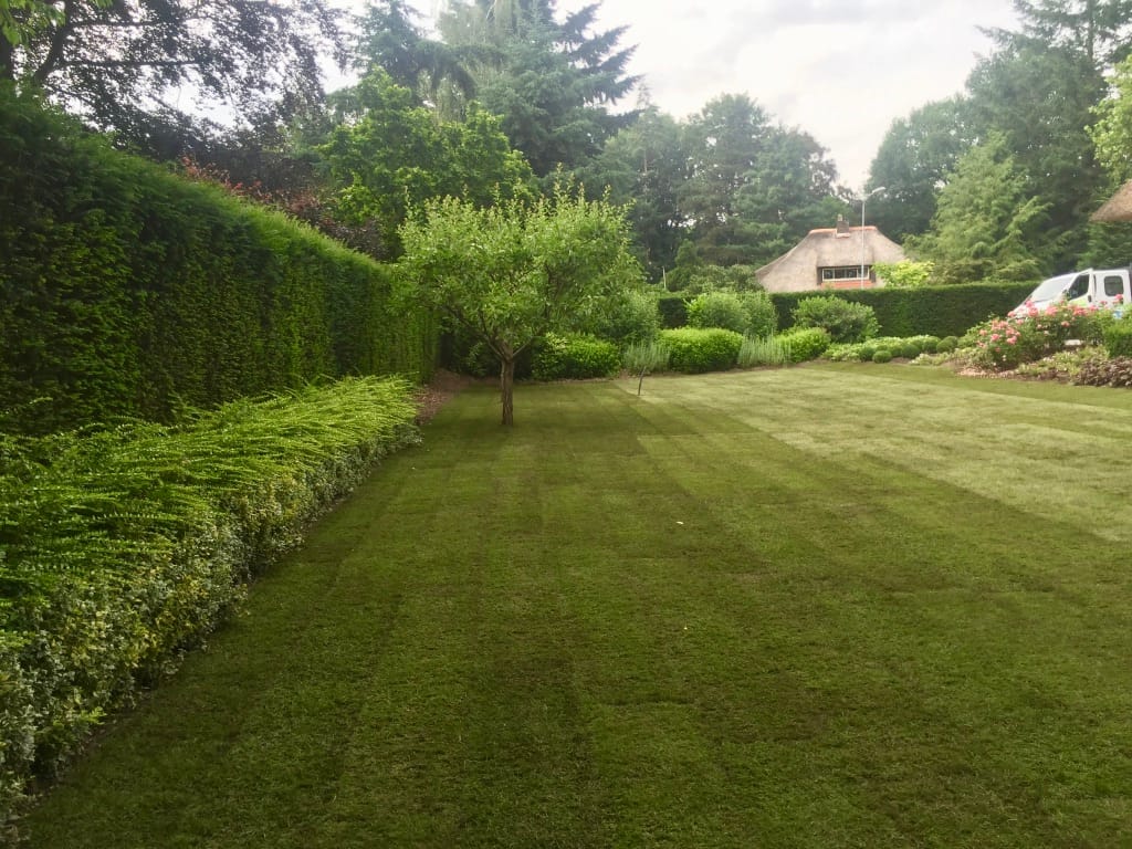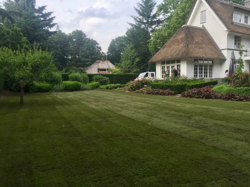 Bij een landelijke villa in Gorssel hebben we 500 vierkante meter graszoden aangelegd. De hoogte van het gras sluit mooi aan op de tegels rondom het zwembad. Door het kleur contrast van de tegels met de graszoden springt het zwembad ook goed uit. In het gazon zijn sproeiers opgenomen zodat het gras goed onderhouden kan worden.