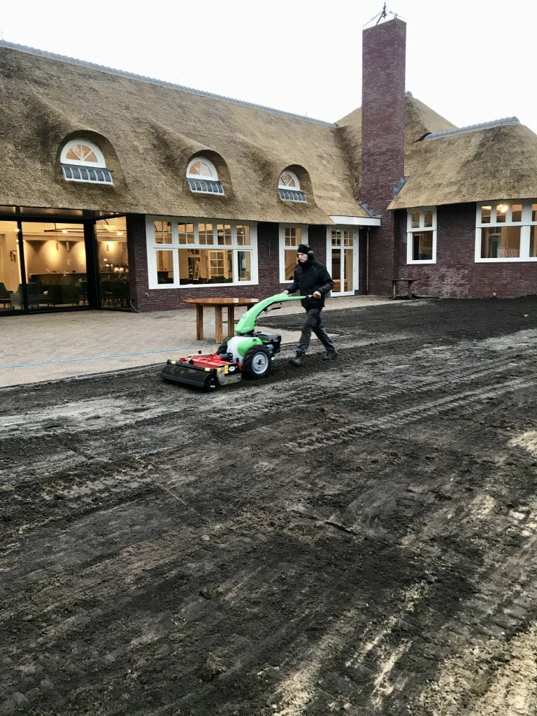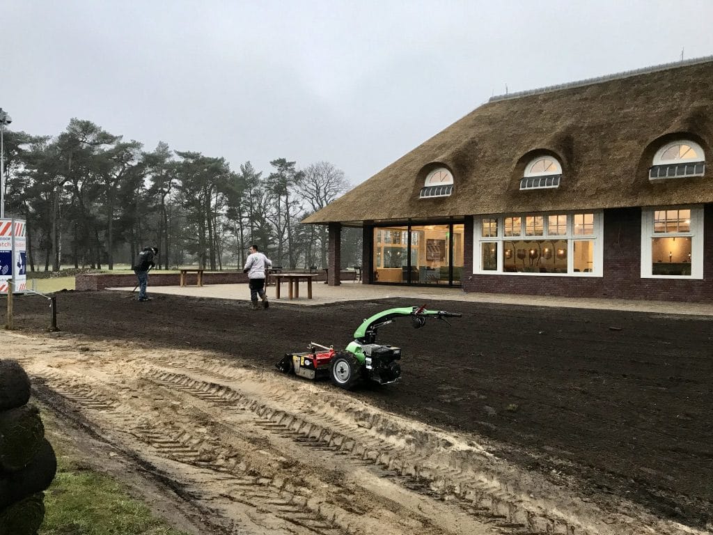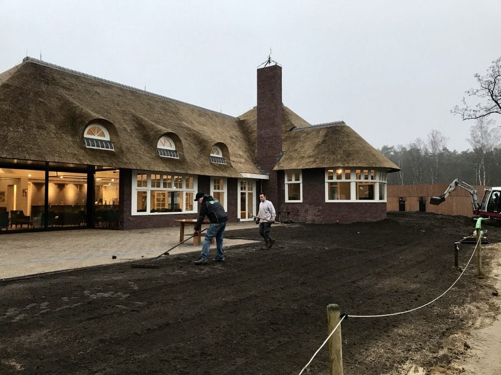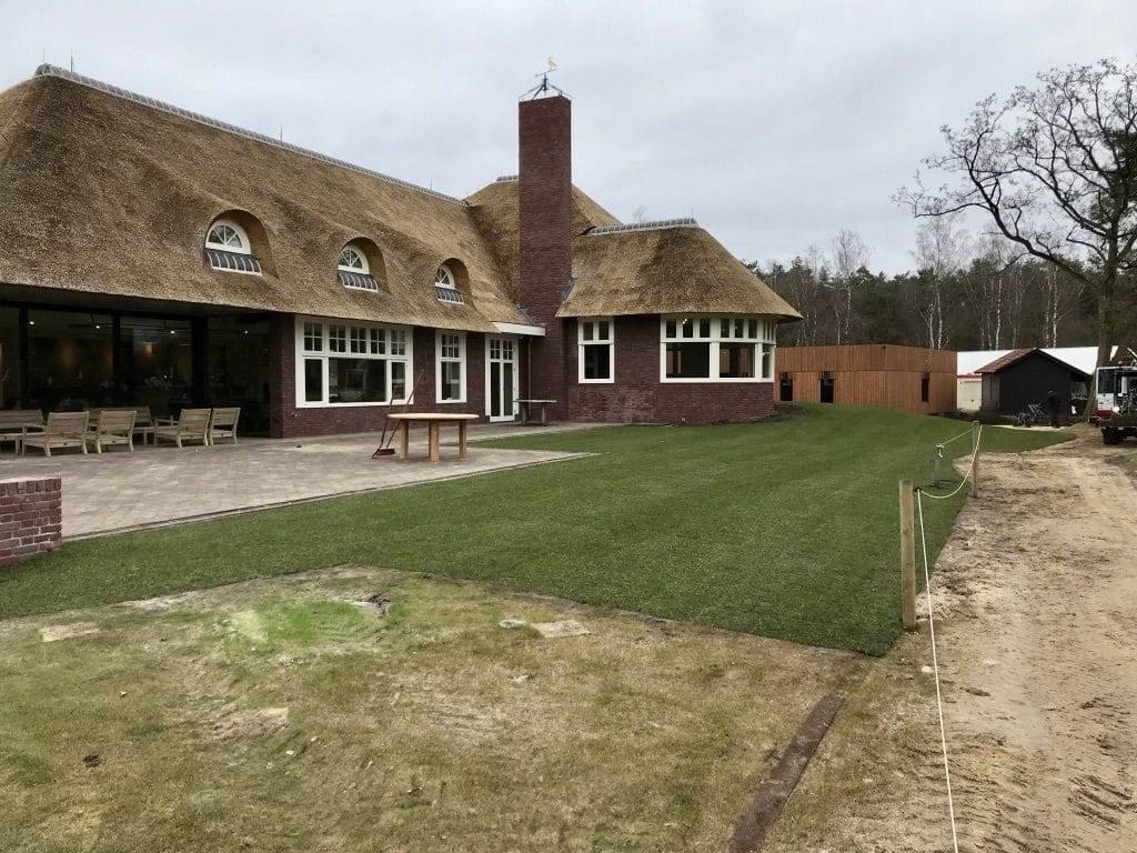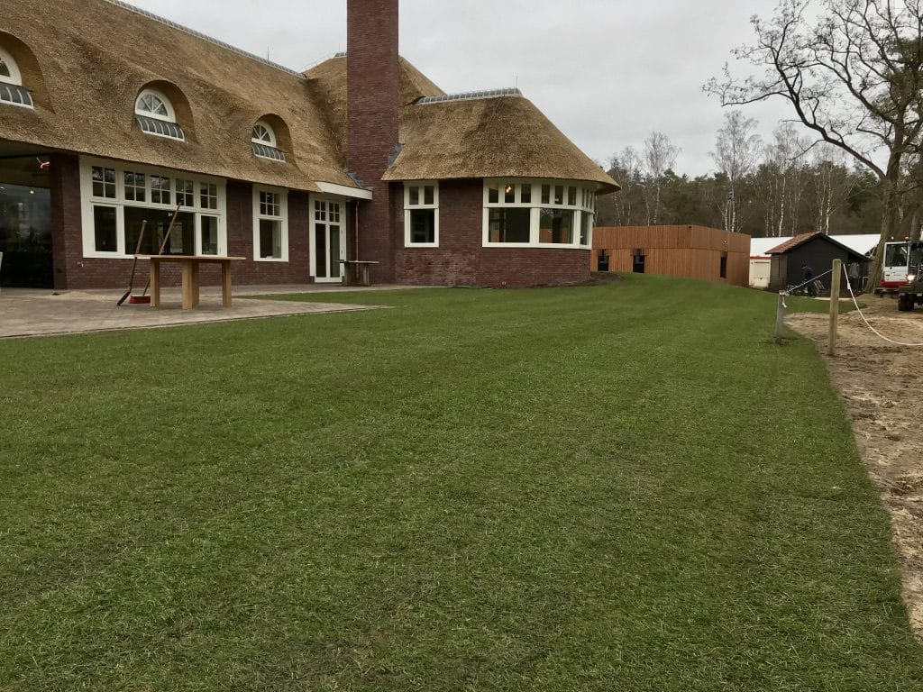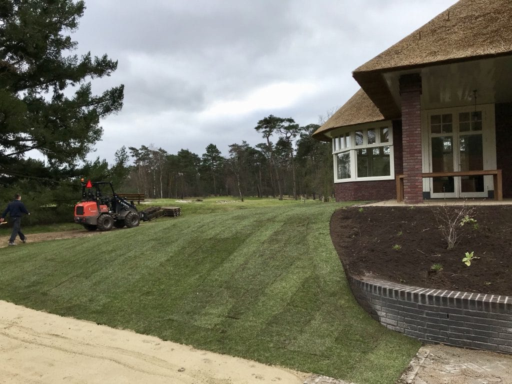 Bij het nieuwe clubhuis op de golfbaan in Hilversum hebben we gras om het terras gelegd. Graszoden geven gelijk een mooi afgewerkt geheel en het gras kan ook snel gebruikt worden. De graszoden hebben we aangesloten op de nieuw aangelegde paden en met de glooiingen van de grond gelegd zodat alles snel natuurlijk lijkt.