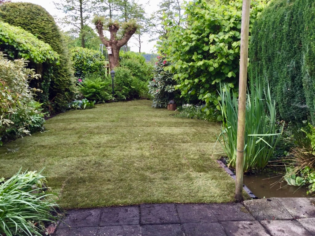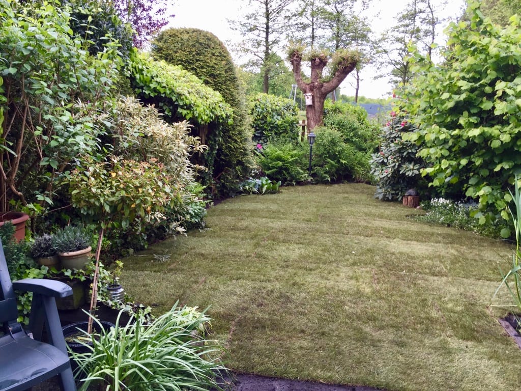 In een dicht beboste tuin in Hoogeveen hebben we toch plaats kunnen vinden voor een partij graszoden. Een mooi gazon zorgt er vaak voor dat de rest van de tuin, zoals straatwerk, overkapping en beplanting, er mooier uitspringt.
