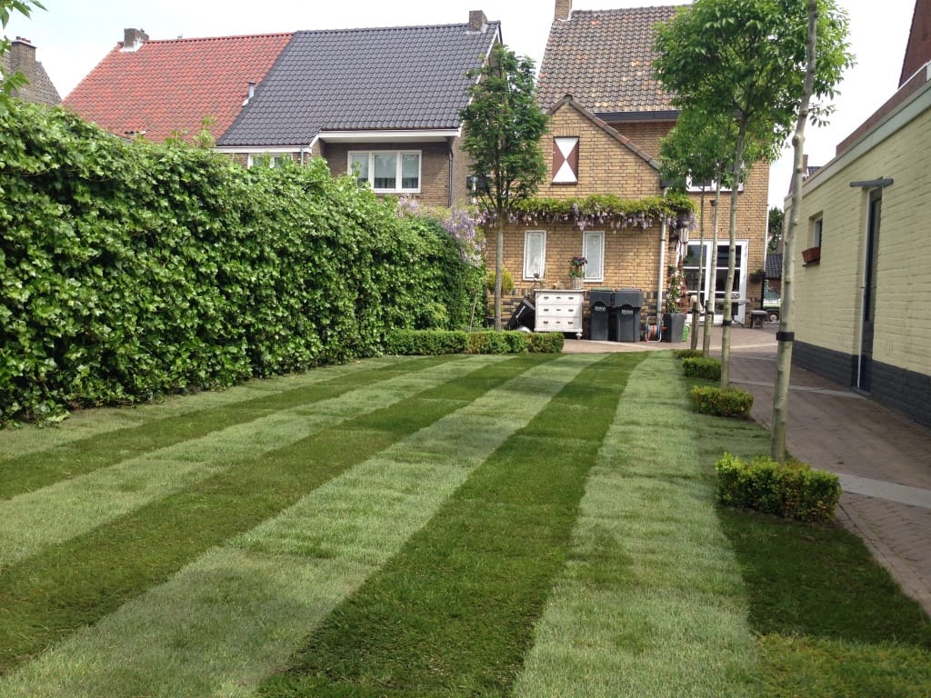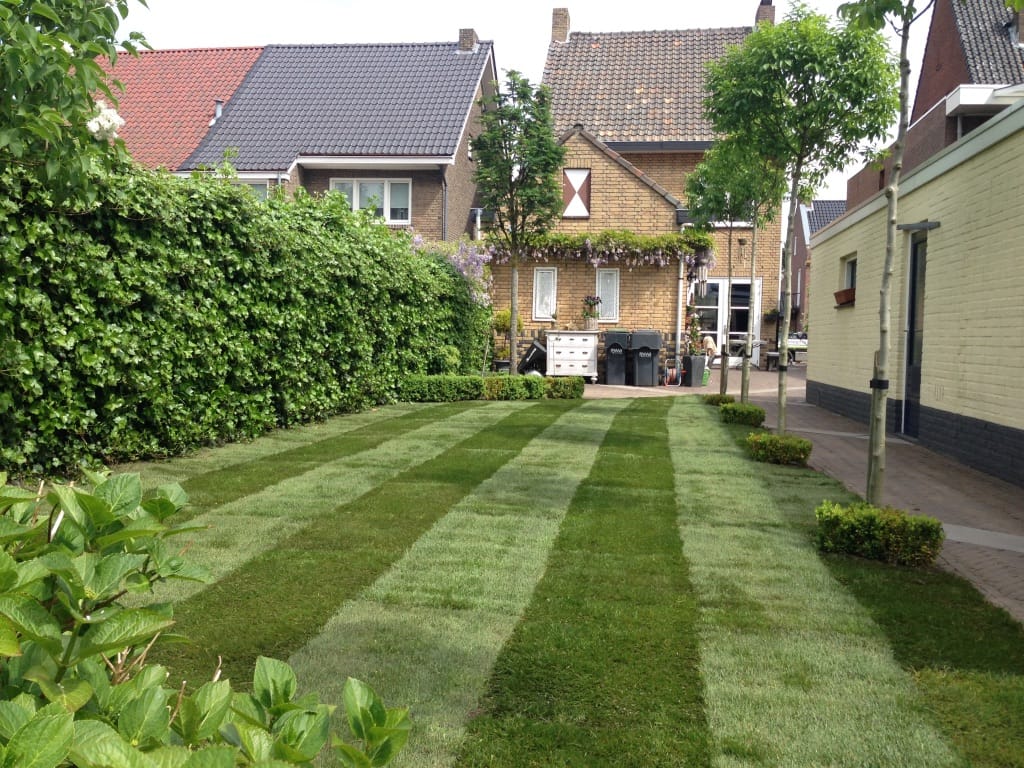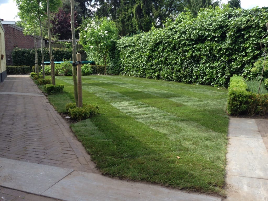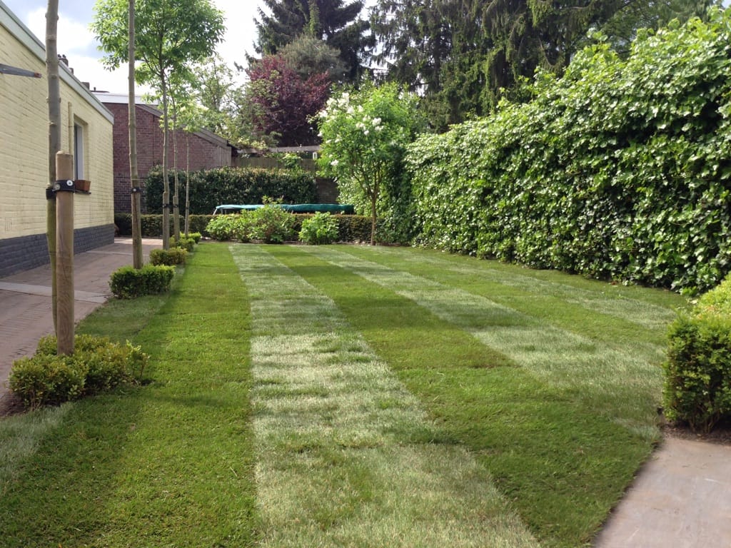 In Neerbeek hebben we een oud gazon vervangen voor een nieuw gazon, het ging om ongeveer 60 m2 gras dat we opnieuw hebben aangelegd. De banen (vleug van het gras) in het gras zijn duidelijk te zien. Na enkele weken trekt dit vanzelf weg.
