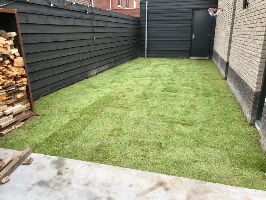 Rondom een nieuwbouwhuis in Oostzaan hebben we graszoden aangelegd. Een trampoline kan tegenwoordig niet meer achterblijven in een tuin waar regelmatig kinderen komen. Om een trampoline goed op te nemen in de tuin is ingraven een mooie maar wel bewerkelijke oplossing. Wanneer een trampoline is ingegraven hoeft er geen gebruik gemaakt te worden van een val net. Daarnaast is het wel veel veiliger dan wanneer de trampoline volledig boven de grond zou staan. Menig dokterspost krijgt namelijk kleine kinderen langs die van een hoge trampoline is gevallen.