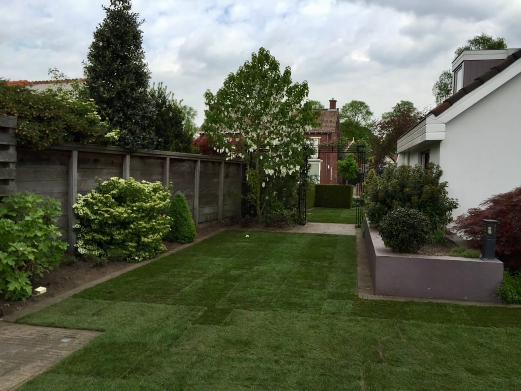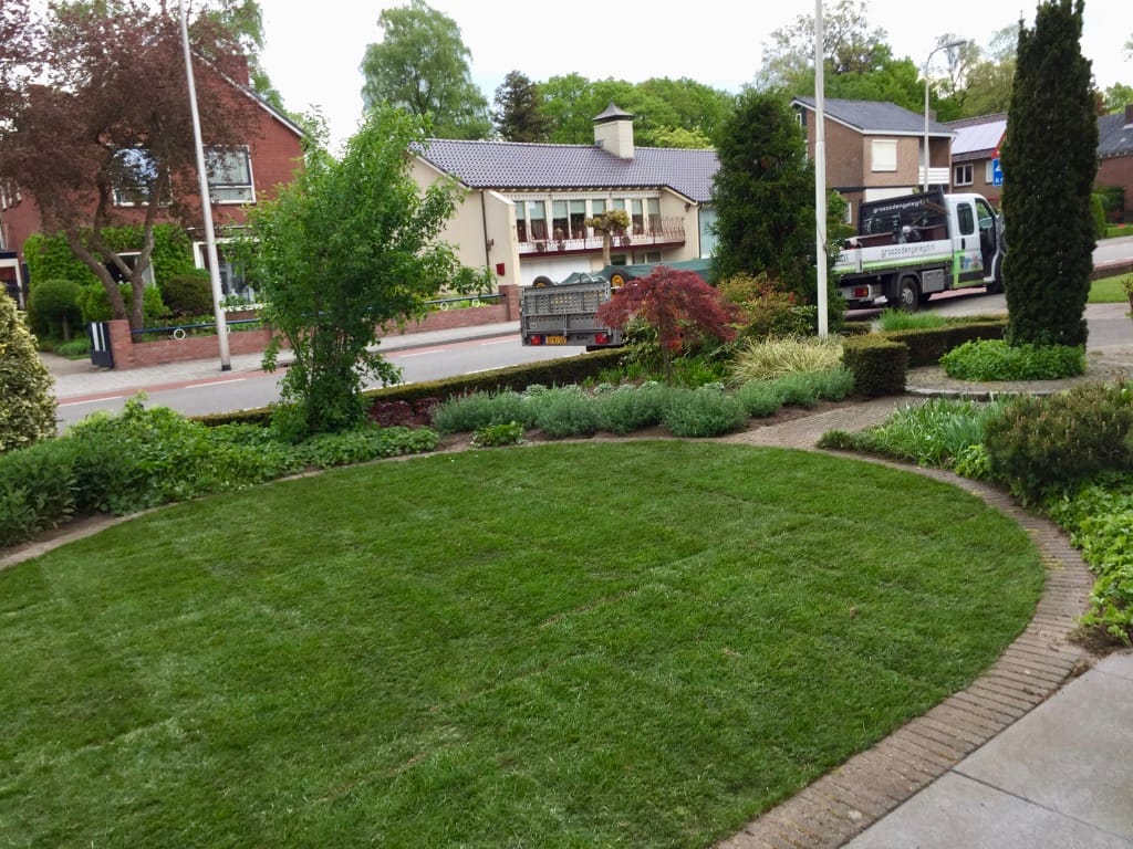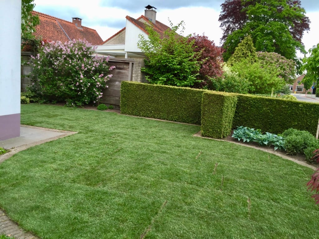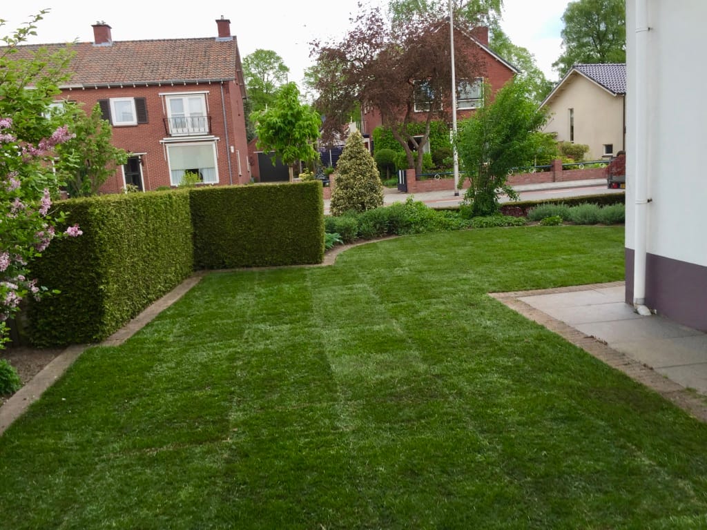 In Rijssen hebben we een oud gazon verwijdert van 105 m2 en tijdens de aanleg het draadje van de robotmaaier terug geplaatst. Het aanleggen van het draadje van de robotmaaier kan vaak eenvoudig na aanleg van de graszoden. Door het draadje onder de graszoden te leggen is het draadje minder kwetsbaar en kan je ook gewoon verticuteren. Na de aanleg van het gras kan je de zode open slaan en het draadje er onderdoor trekken.